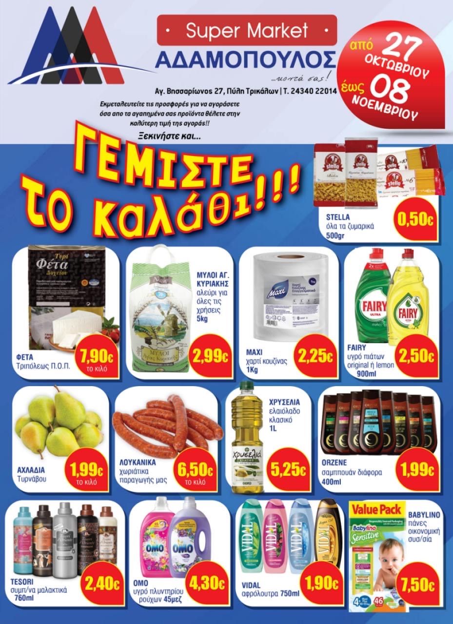Ξεκίνησε από τη Δευτέρα 27 Οκτωβρίου το νέο φυλλάδιο προσφορών του Super Market ΑΔΑΜΟΠΟΥΛΟΣ στην Πύλη.  Ανακαλύψτε ασυναγώνιστες τιμές σε όλα τα τμήματα του καταστήματος: